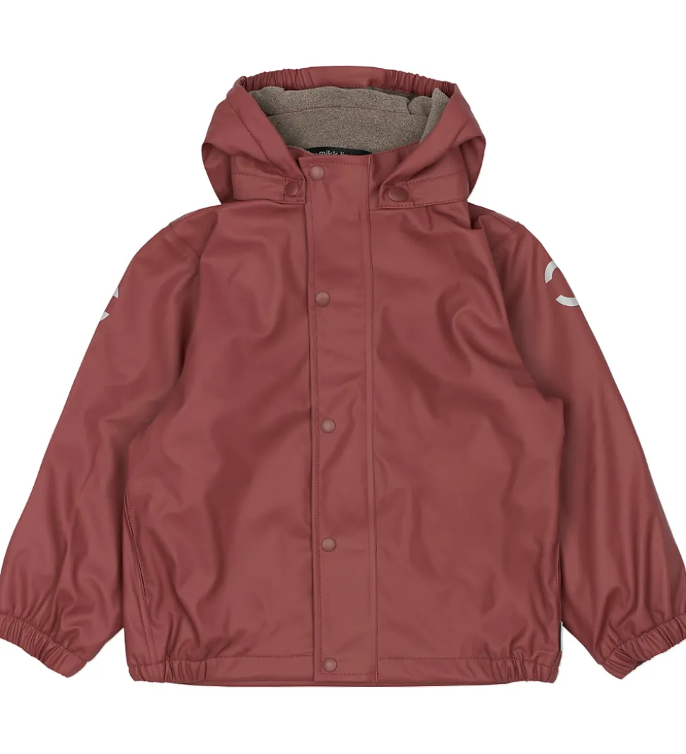 Fint Mikk-Line regntøj bestående af en regnjakke og et par regnbukser med seler i mørkerød PU. Regntøjet har refleksdetaljer med teksten “Recycled”.