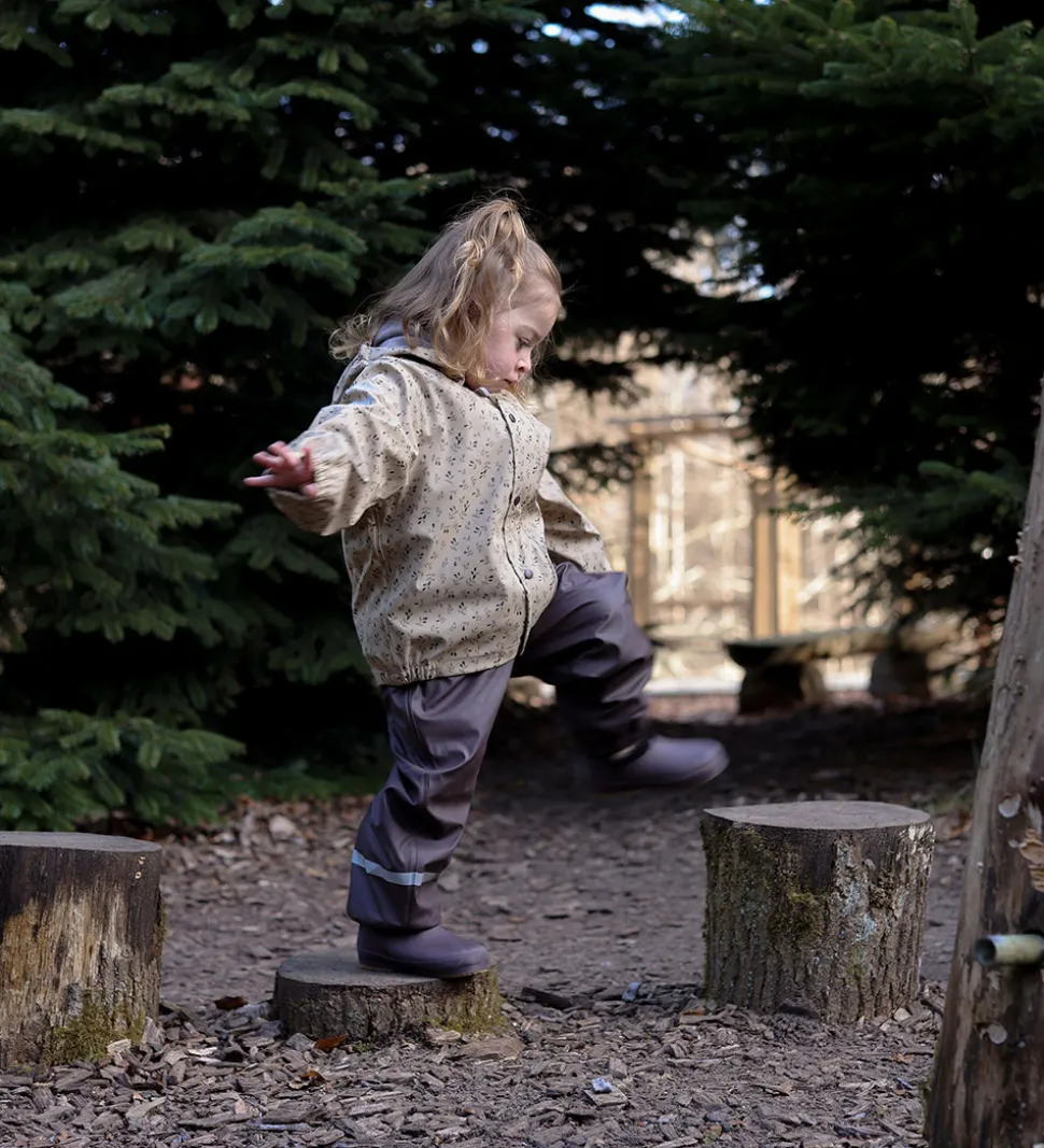 Sejt Mikk-Line regntøj af PU bestående af en regnjakke og et par regnbukser med seler. Regnbukserne er i ensfarvet mørkebrun, mens regnjakken er i lysebrun med et plante-alloverprint i grønne og brune nuancer.