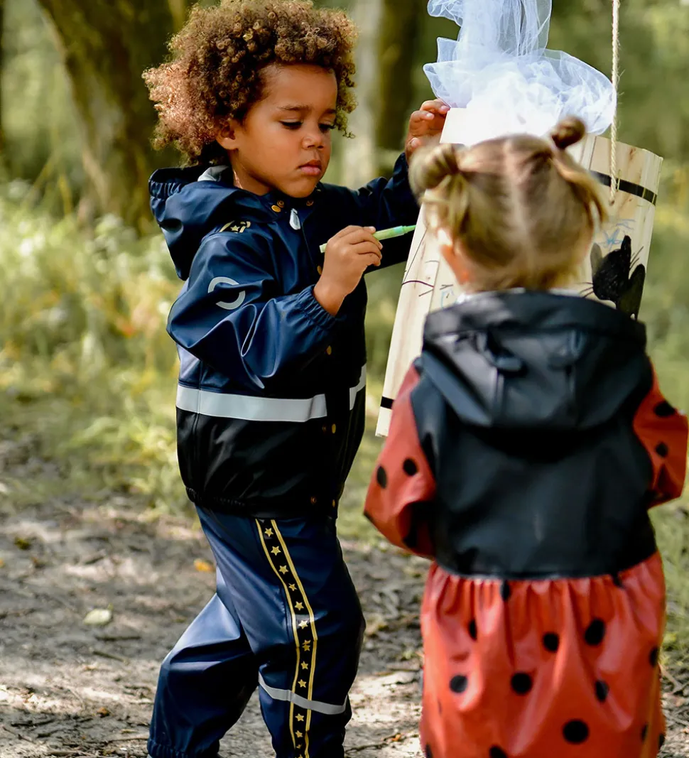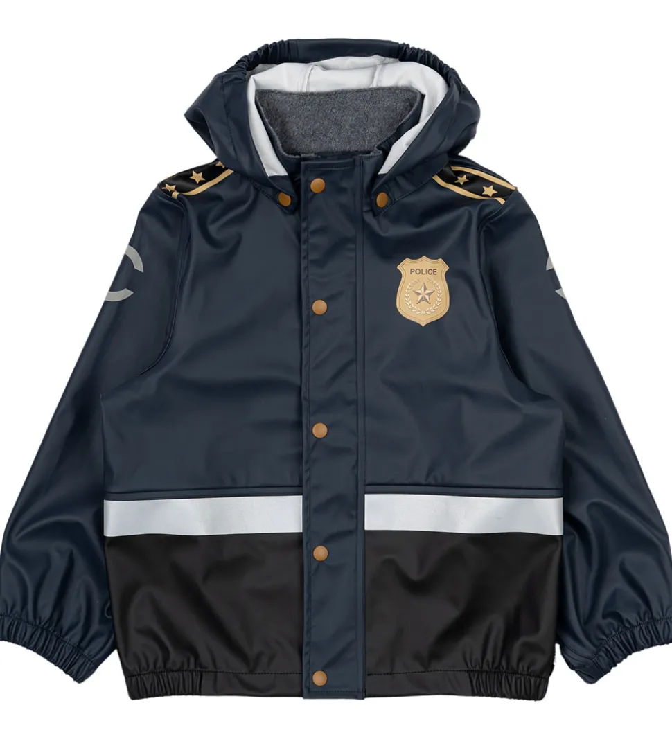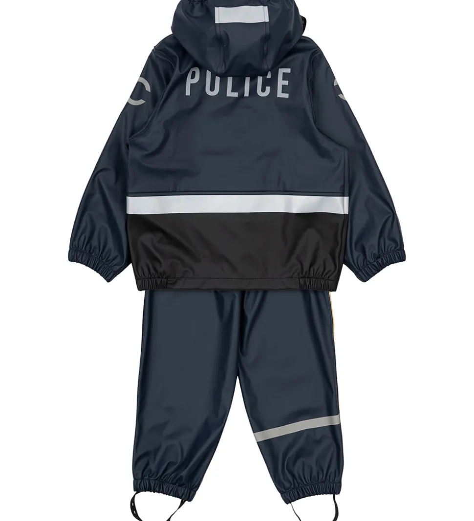 Sejt Mikk-Line regntøj af PU bestående af et par regnbukser med seler og en regnjakke. Regntøjet er navyblåt og i et politibetjent-design, som er lavet med flotte print, så regntøjet ligner en politiuniform.
