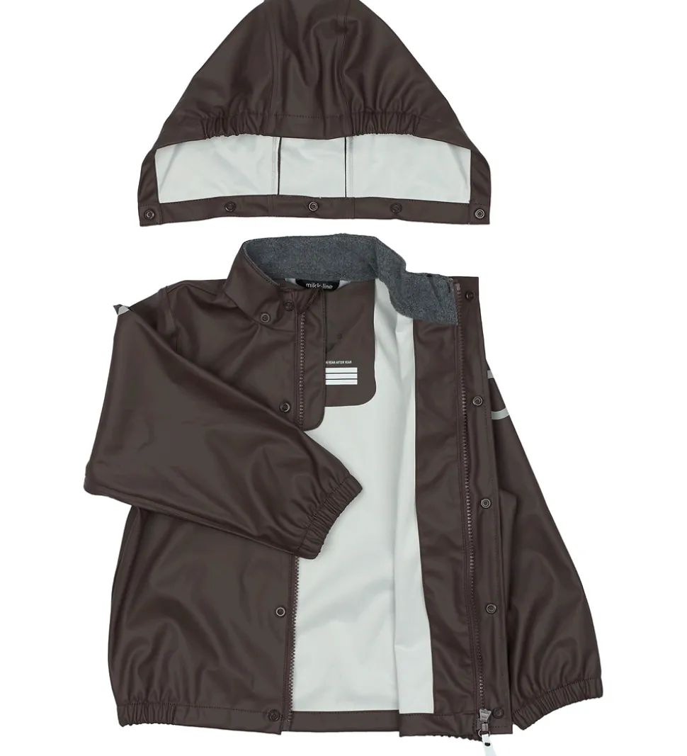 Pænt Mikk-Line regntøj bestående af et par regnbukser med seler og en regnjakke i ensfarvet mørkebrun samt med velplacerede refleksdetaljer og -logoer.