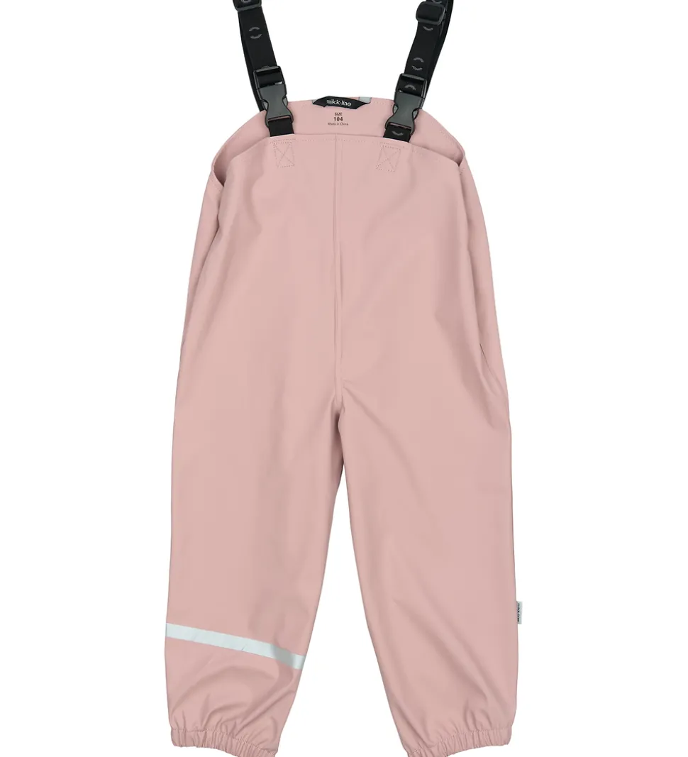 Regnbukserne har justerbare elastiskseler og åbnes fortil med klikspænder. De har også en justerbar elastikkant i livet, ligesom buksebenene også har elastikkanter. Ved anklerne er der justerbare, aftagelige elastikstropper, som kan sættes under gummistøvlerne.