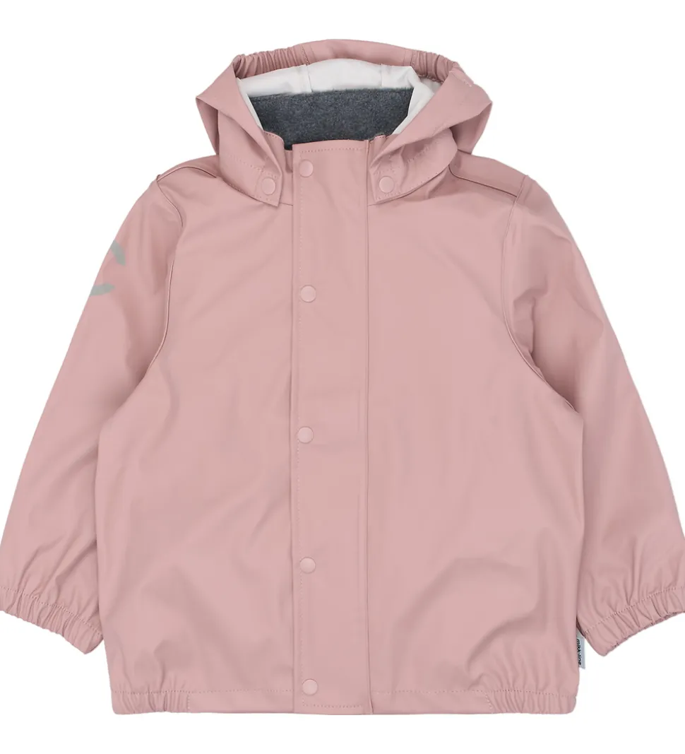 Fint Mikk-Line regntøj bestående af en regnjakke og et par regnbukser i ensfarvet, rosa PU.