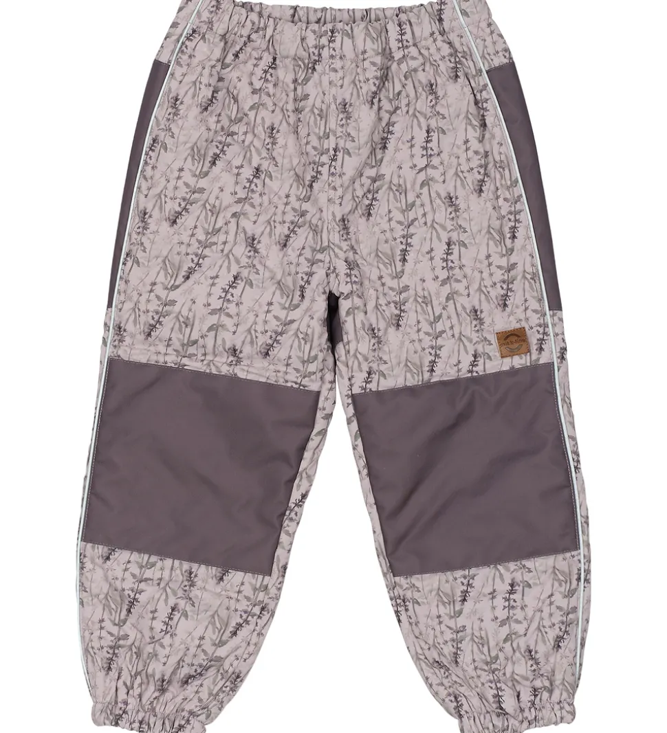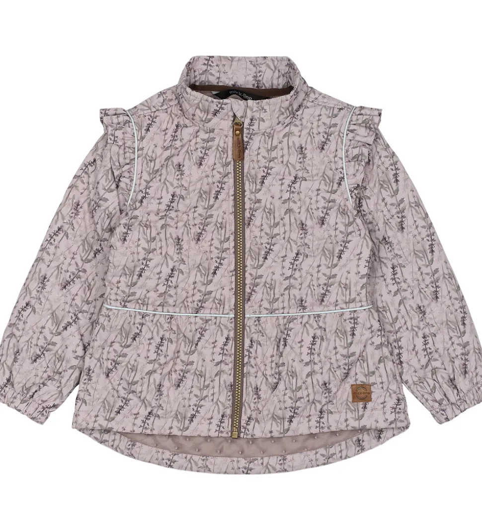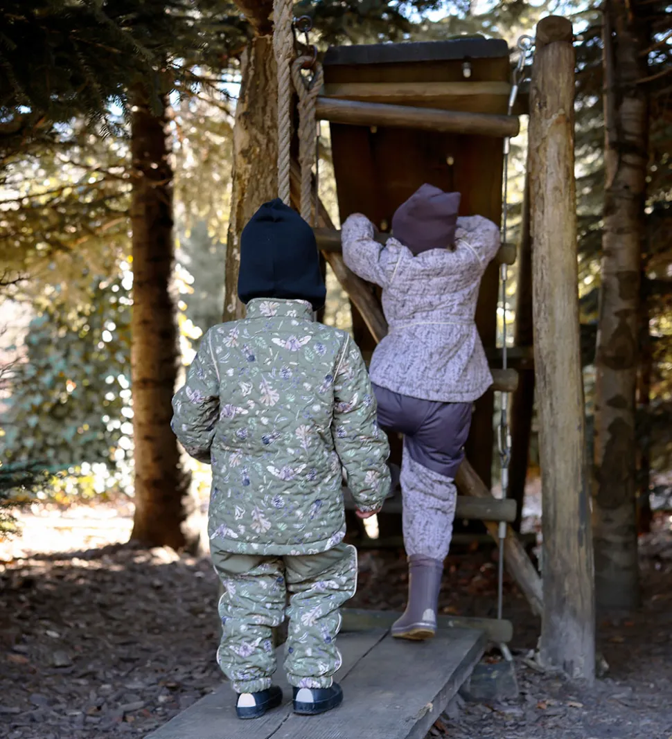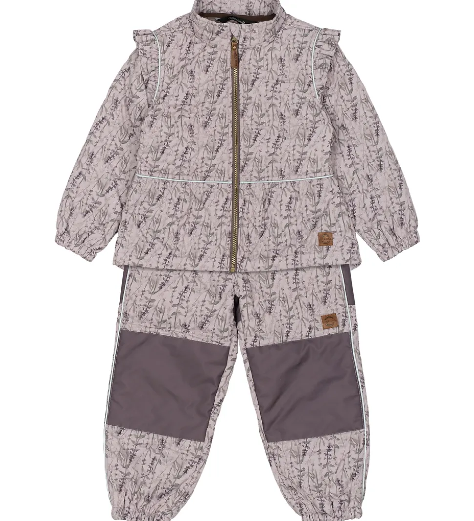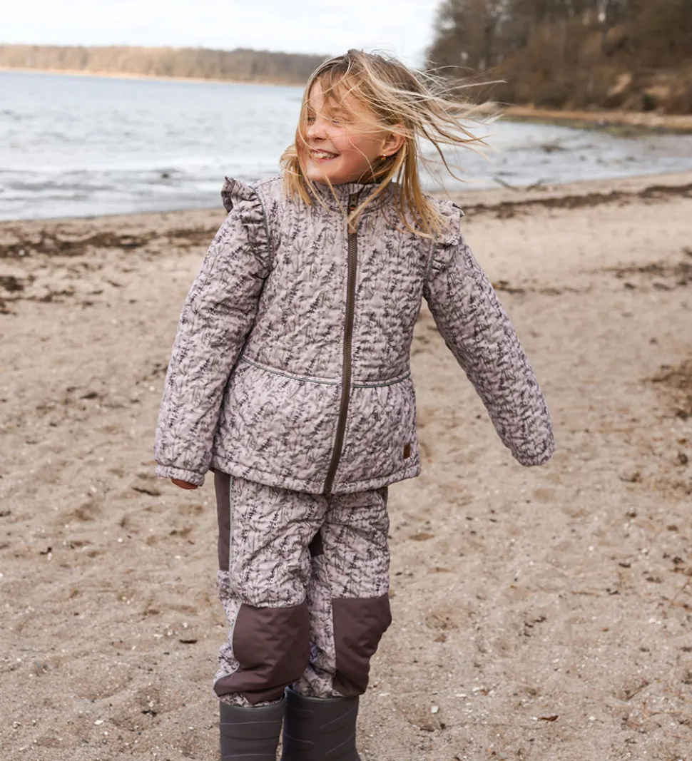 Skønt Mikk-Line termotøj bestående af en termojakke og et par termobukser i lys, støvet lilla med et alloverprint i afdæmpede nuancer og med et indpræget prikmønster, der laver en flot struktur. Termojakken har flotte flæser med reflekspipings.
