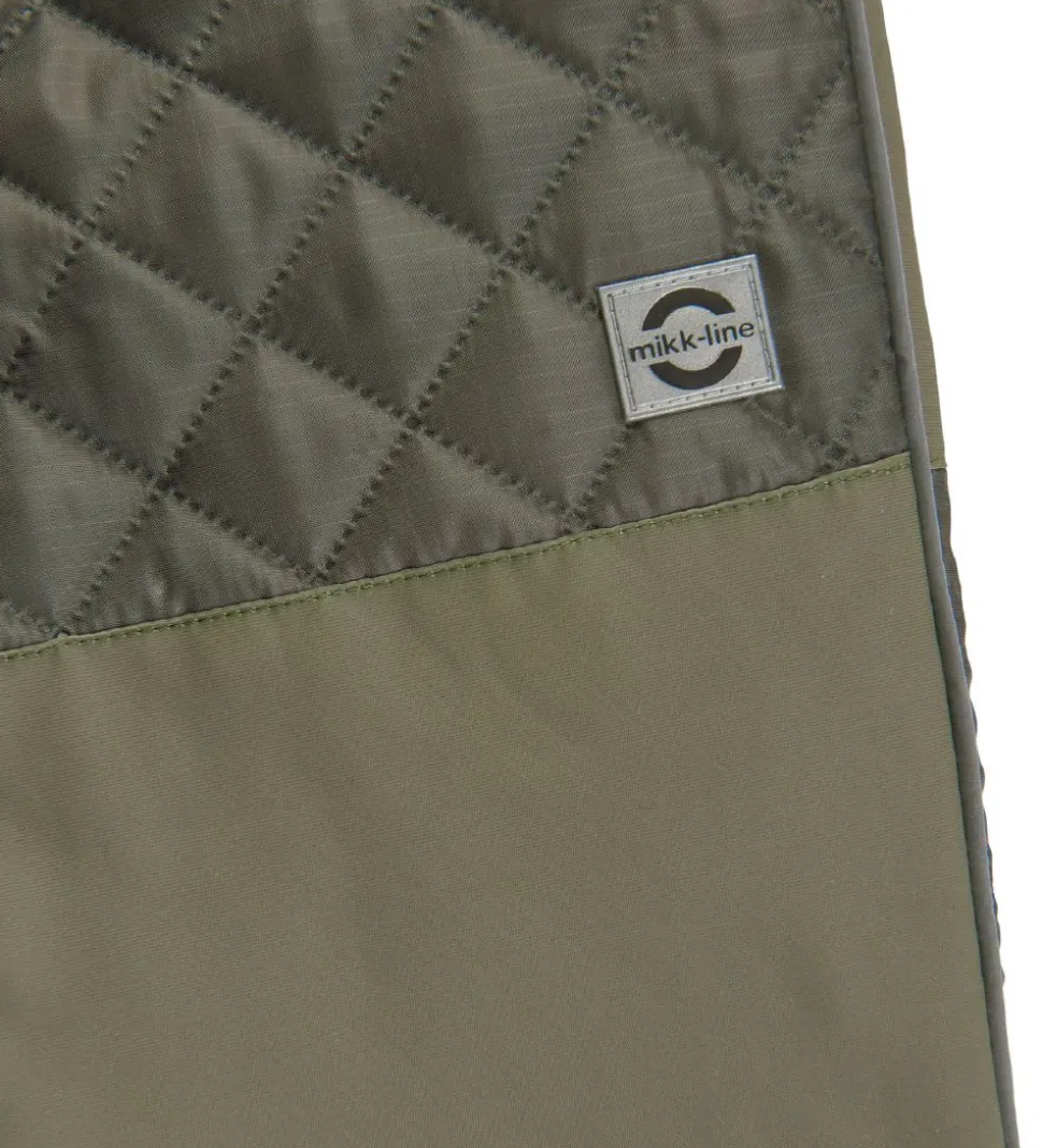 Lækkert Mikk-Line termotøj bestående af en termojakke og et par termobukser i støvet grøn med en quiltet struktur.