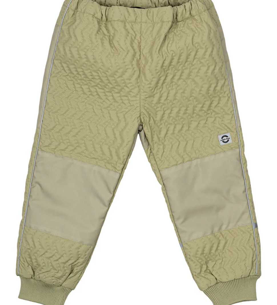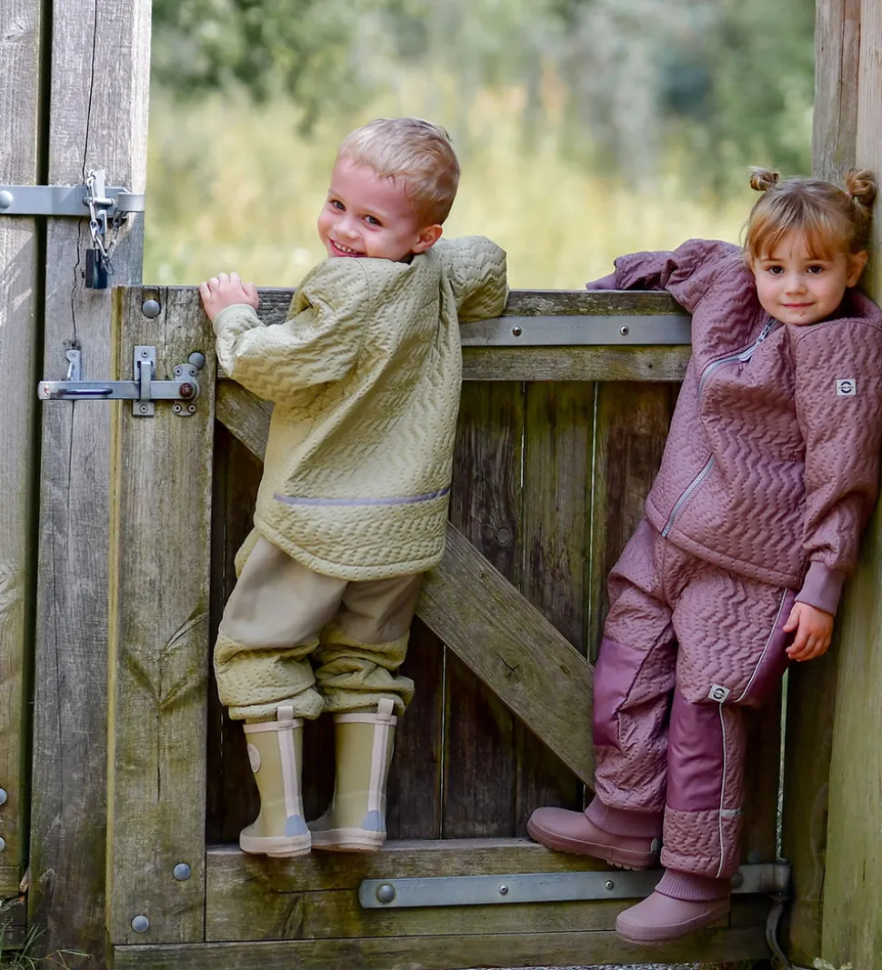 Lækkert Mikk-Line termotøj bestående af en termojakke og et par termobukser i lys, støvet grøn. Termotøjet har en struktur af striber med indprægede, små prikker.
