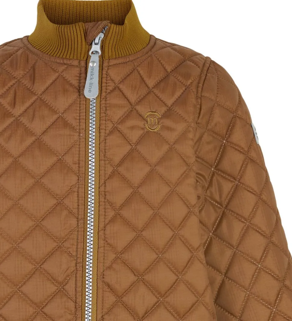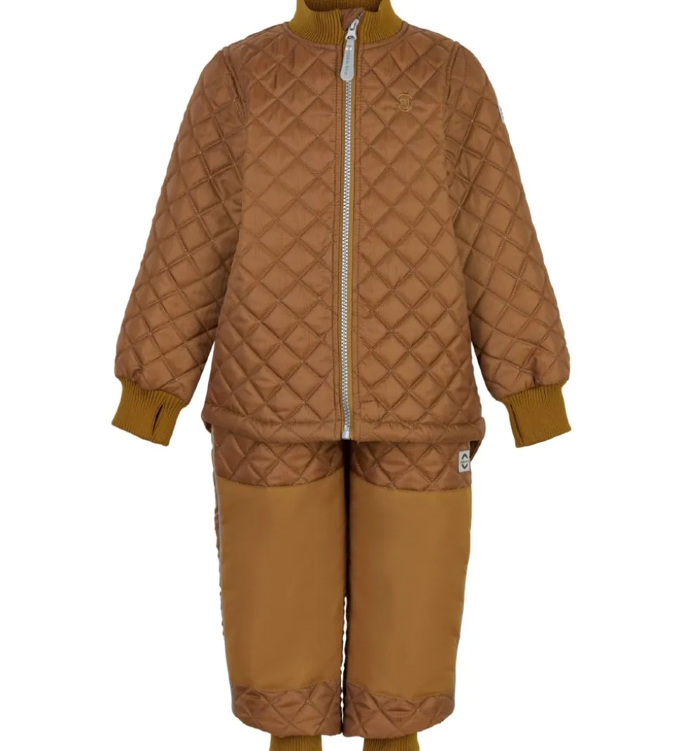 Smart Mikk-Line termotøj bestående af en termojakke og et par termobukser i brun i en glatvævet kvalitet og med en quiltet struktur.