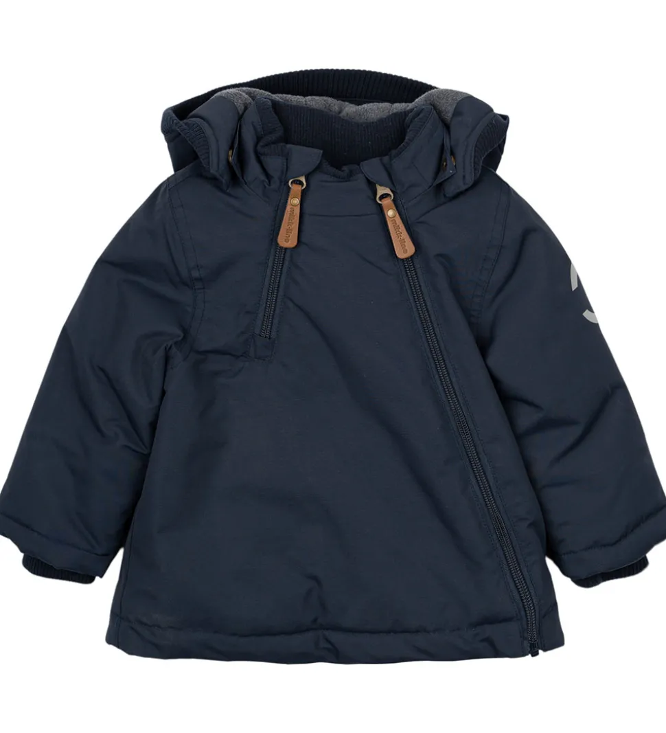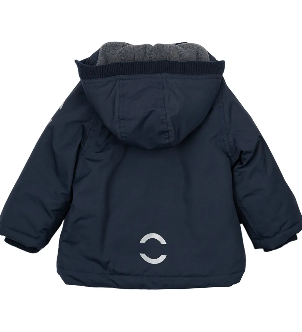 Lækker Mikk-Line vinterjakke i mørkeblå med refleksdetaljer på venstre ærme og nederst på ryggen.