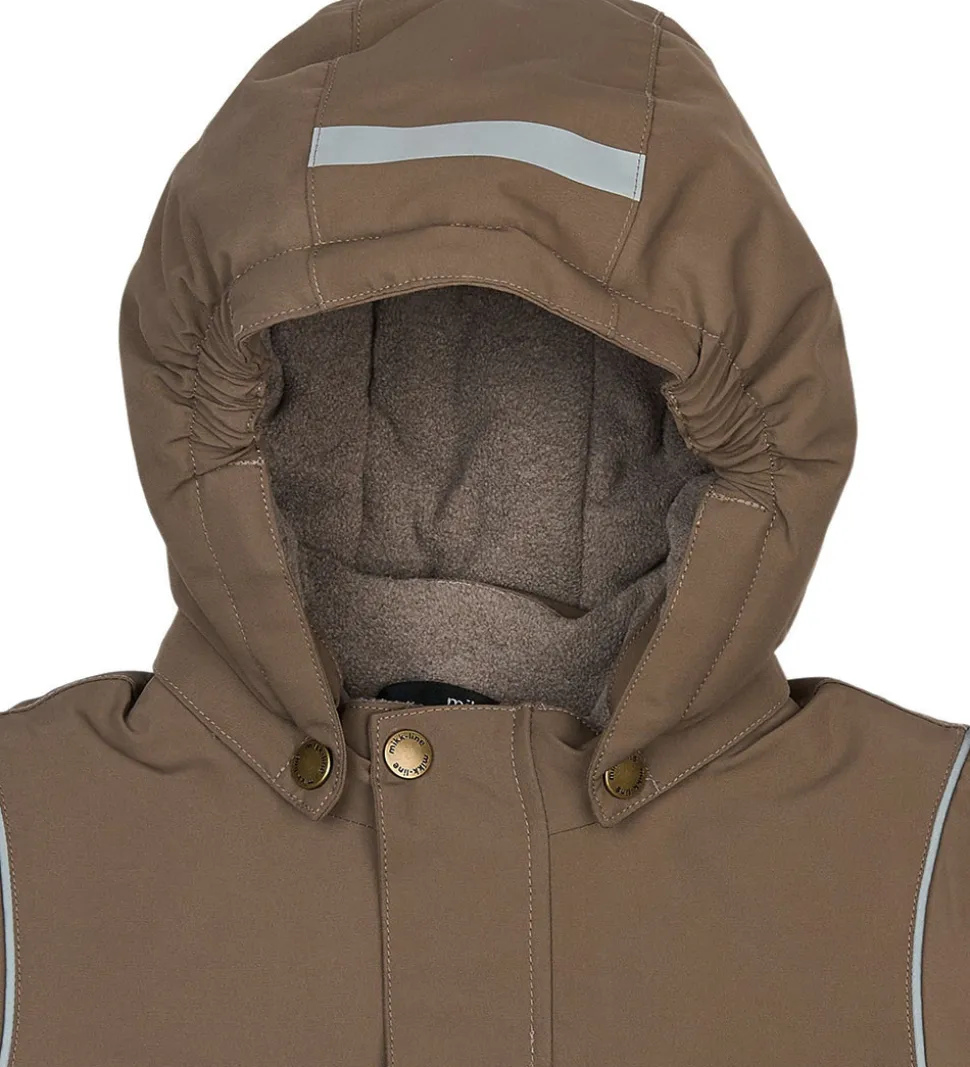Pæn Mikk-Line vinterjakke i lysebrun. Vinterjakken har refleksdetaljer på hætten, nederst på ryggen og omkring skuldrene.