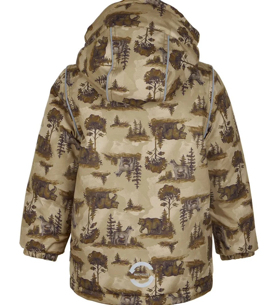 Skøn Mikk-Line vinterjakke i beige med et mørkt alloverprint af skov, bjrøne og ulve.