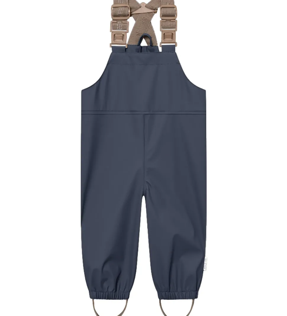 Mini A Ture regnbukserne har elastiske seler, som krydses på ryggen. Selerne kan justeres i længden og åbnes fortil med klikspænder. Regnbukserne har en elastikkant i ryggen og omkring anklerne, og der er justerbare, aftagelige gummistropper, som kan sættes under fodtøjet.