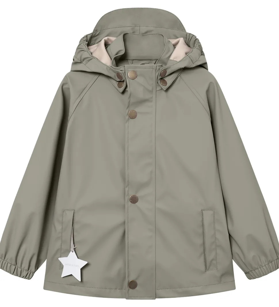 Smart Mini A Ture regntøj bestående af en regnjakke og et par regnbukser i ensfarvet, støvet grøn PU.