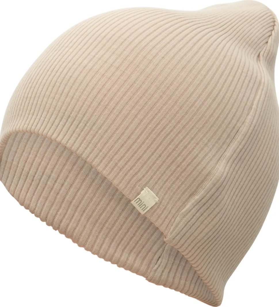 Lækker Minimalisma hue i ensfarvet beige med ribstruktur, og den er lavet af blødt merinould. Minimalisma huen har en rund hovedform, og den består af to lag.