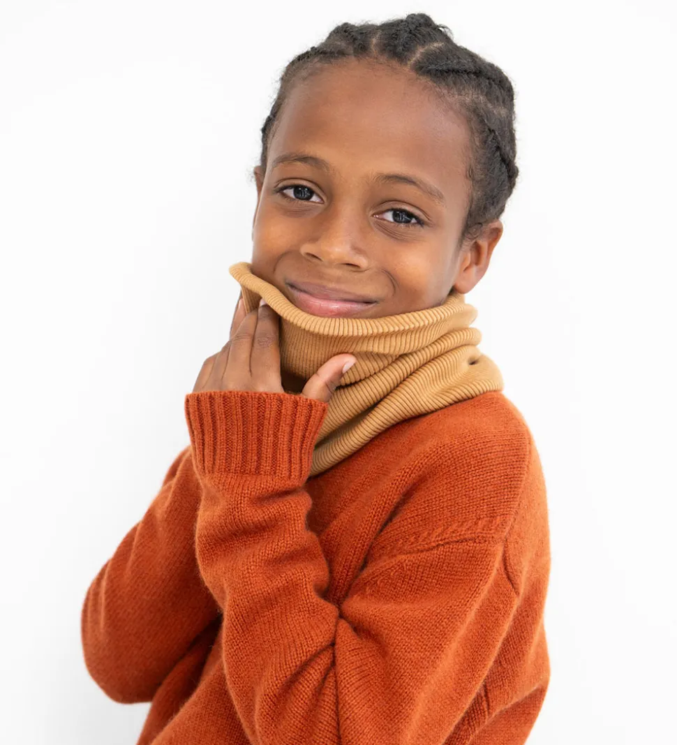Skønt Minimalisma tube i karrgul med ribstruktur, og det er lavet af blødt merinould. Minimalisma tubetørklædet består af to lag i en let kvalitet.