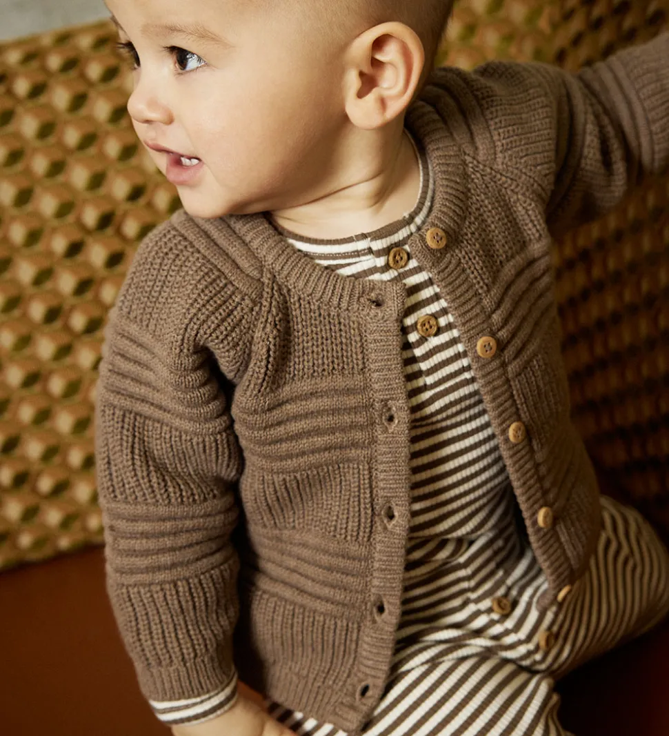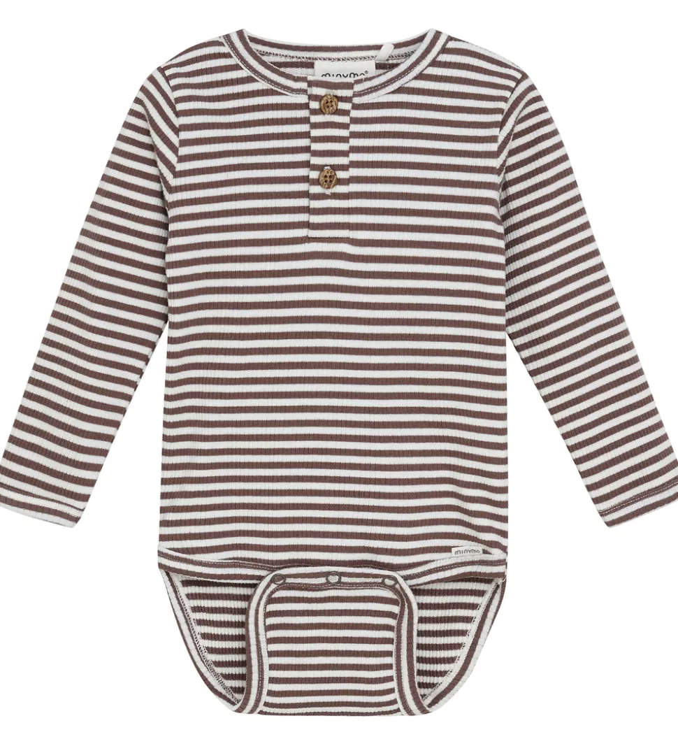 Smart Minymo body i stribet brun og hvid med ribstruktur. Bodyen har en rund halsudskæring med knapper fortil. Den har lange ærmer og lukkes med trykknapper mellem benene.