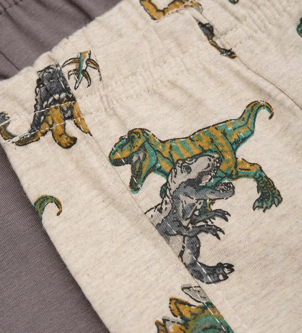 Fine Minymo boxershorts i en pakke med to par. Det ene par er ensfarvet gråbrunt, mens det andet par har et mønster med farverige dinosaurer på en lys baggrund. Minymo boxershortsene har en elastikkant i taljen, der sikrer en behagelig pasform.