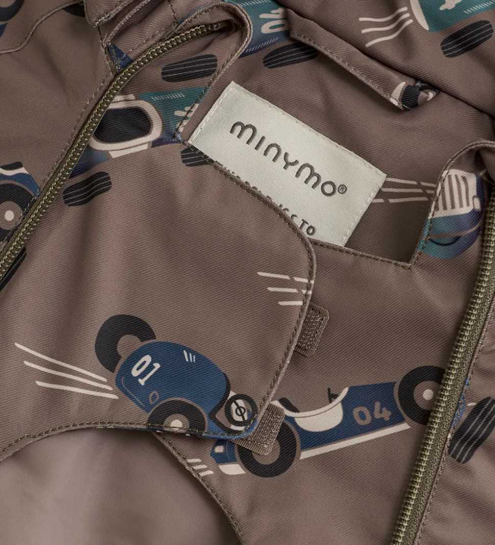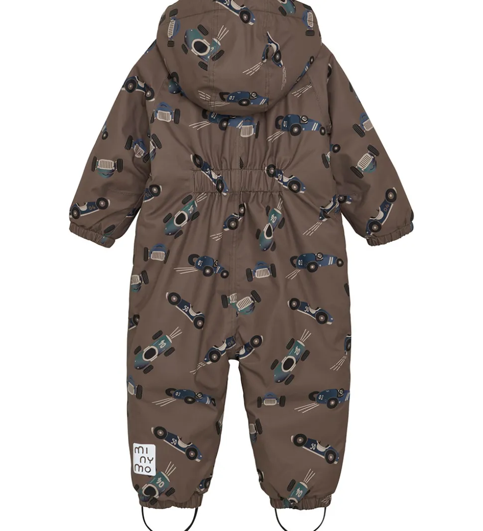 Smart Minymo flyverdragt i brun med et alloverprint af racerbiler i blå og grønne nuancer. Flyverdragten har praktiske refleksdetaljer.