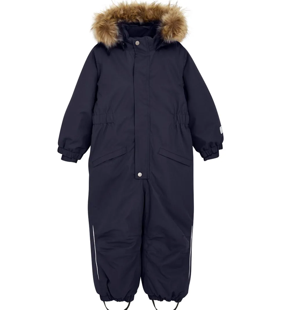 Flot Minymo flyverdragt i mørkeblå med praktiske refleksdetaljer.