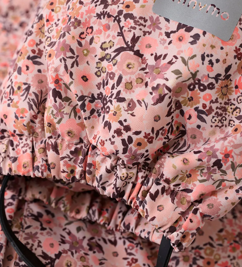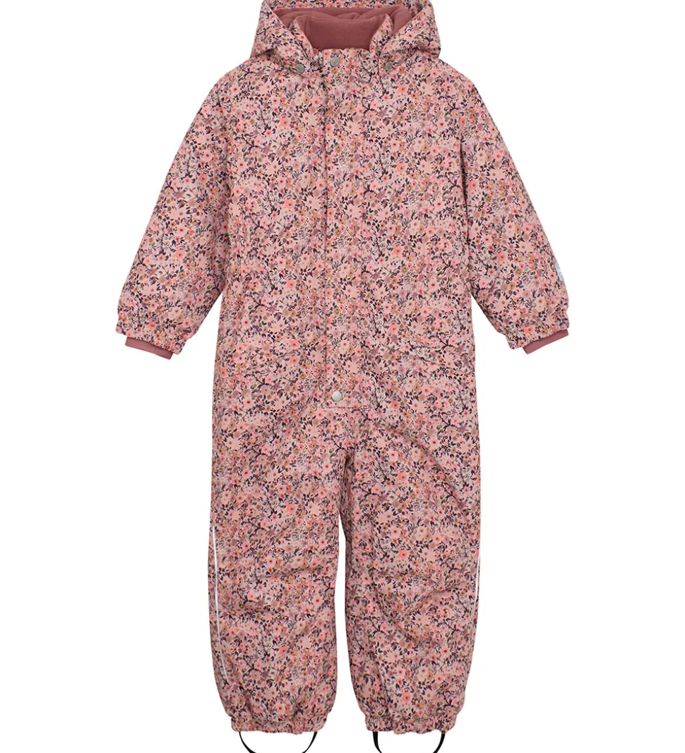 Smart Minymo flyverdragt i rosa med et alloverprint af blomster i lilla, brune og rosa nuancer. Flyverdragten har praktiske refleksdetaljer.