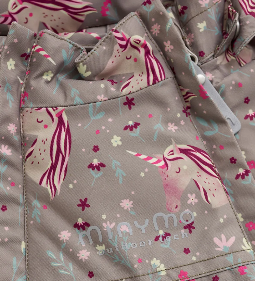 Skøn Minymo flyverdragt i lysegrøn med et alloverprint af enhjørninger og blomster i lilla, grønne og pink nuancer. Flyverdragten har praktiske refleksdetaljer.