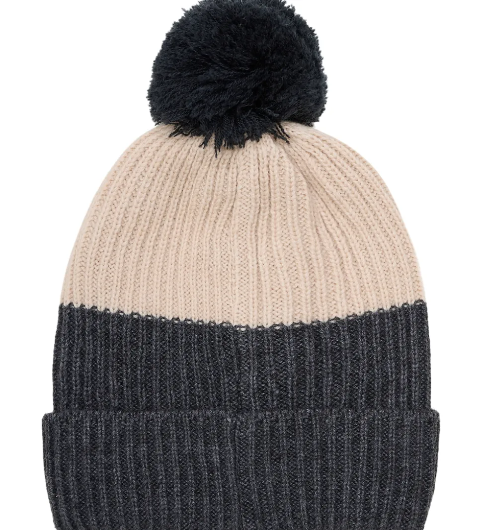 Lækker Minymo hue i mørkeblå og beige. Huen er strikket i en flot ribstruktur og har en sort kvast på toppen.