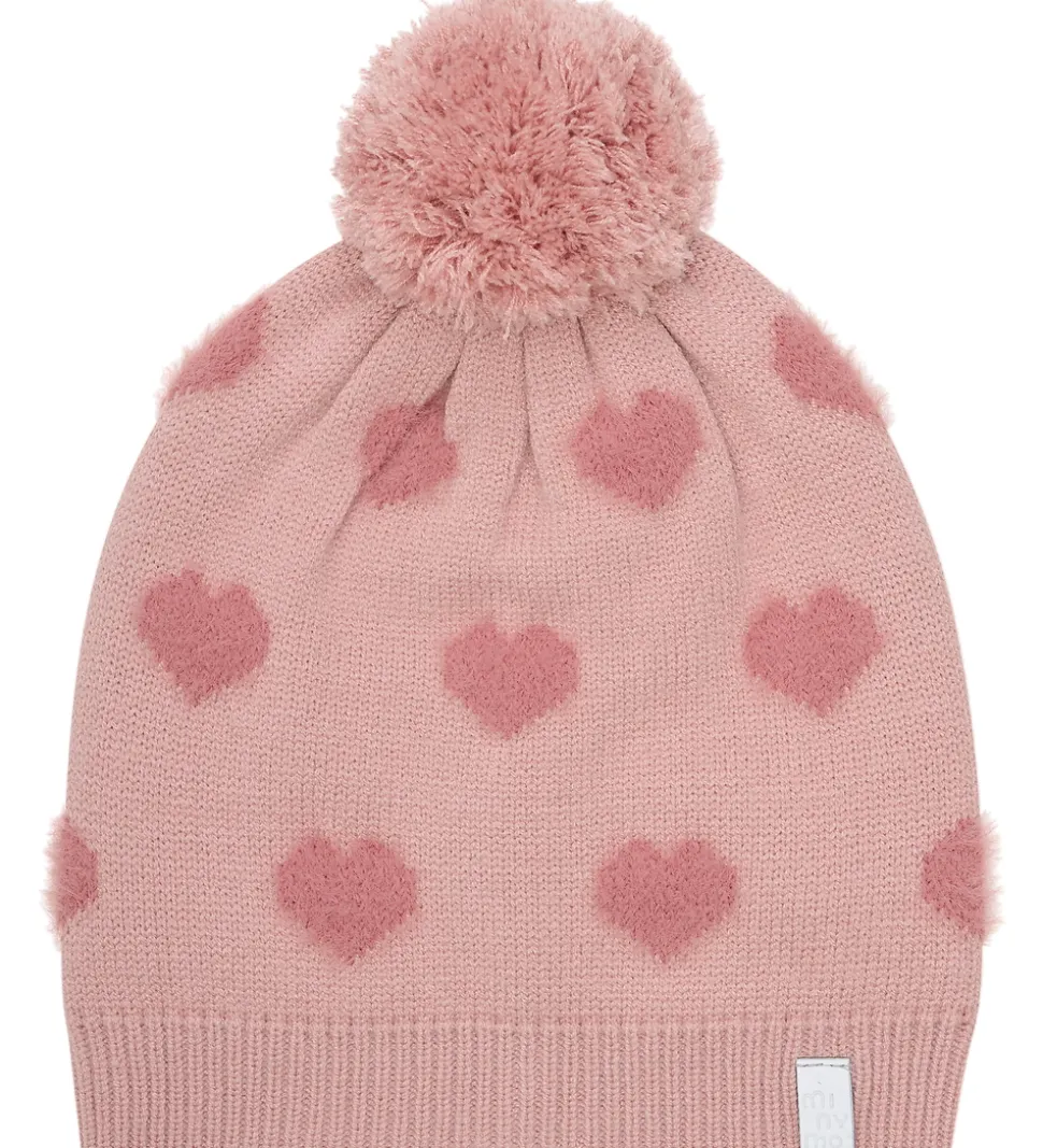 Lækker Minymo hue i rosa med plyssede hjerter over det hele i en mørkere nuance. Huen er strikket og har en sød kvast på toppen.