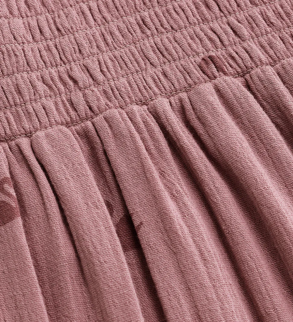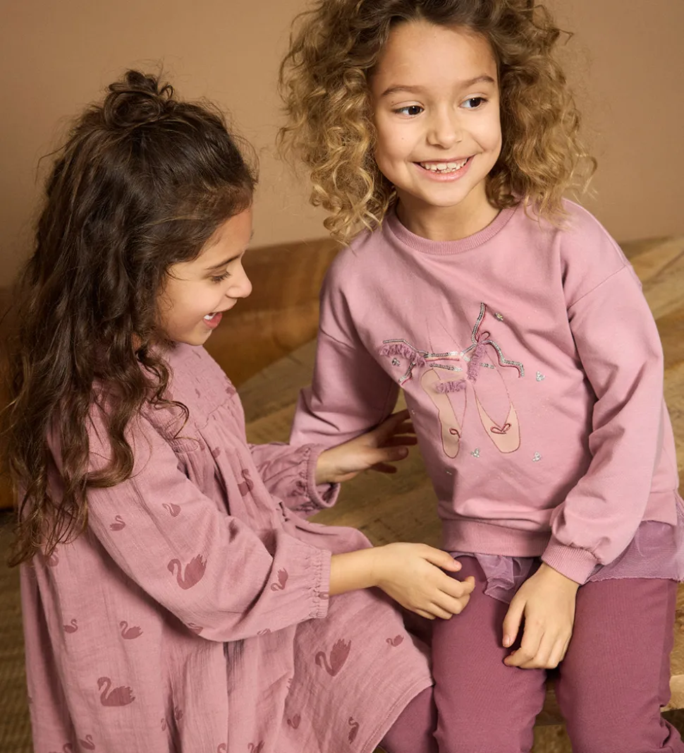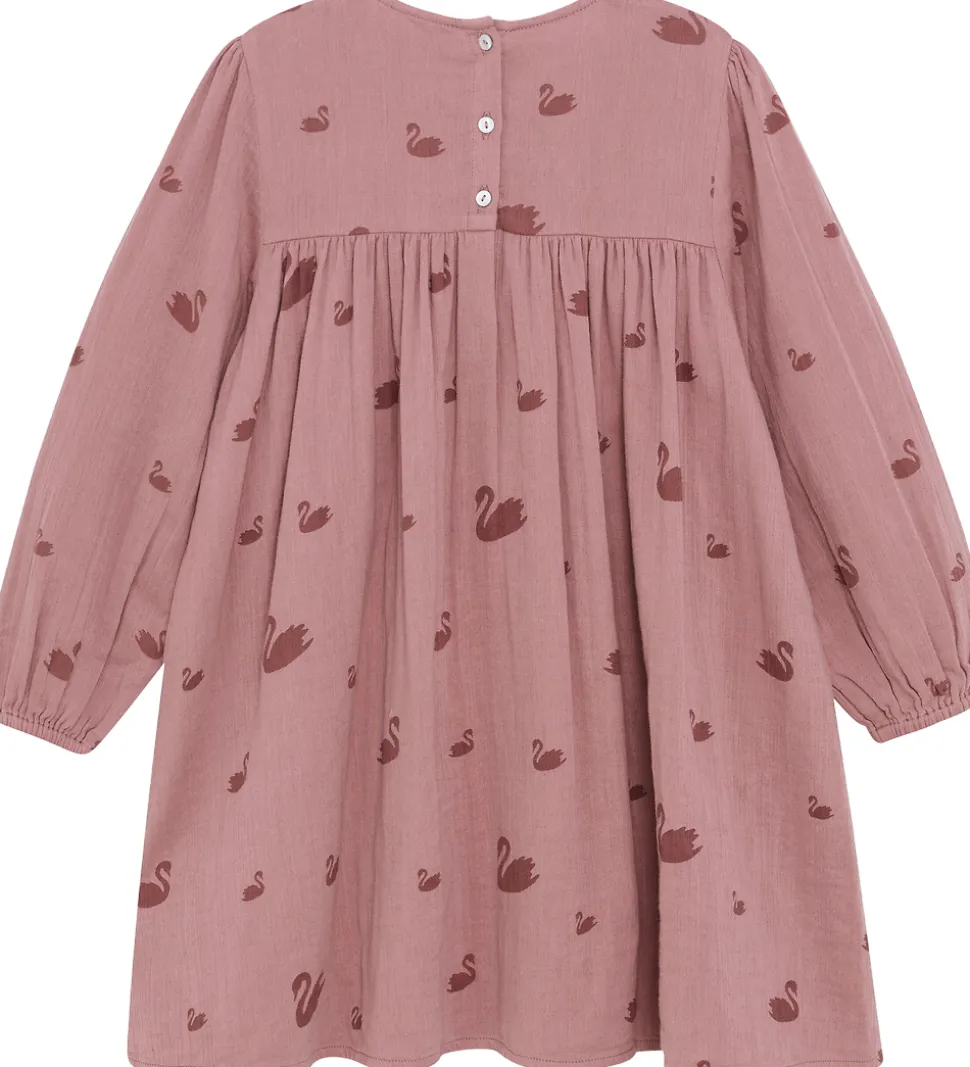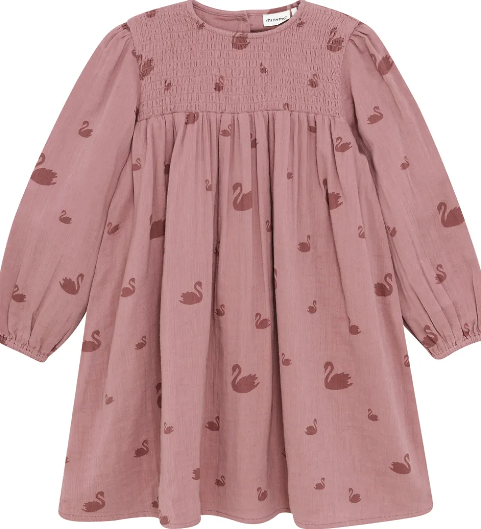 Elegant Minymo kjole i rosa med et alloverprint af svaner i en mørkere rosa nuance. Minymo kjolen er designet med smock ved brystet, og tre knapper i nakken, så den er let at få over hovedet. Den har lange ærmer og elastiske manchetter. Kjolen har en lækker musselinstruktur, som gør at den føles let at have på.
