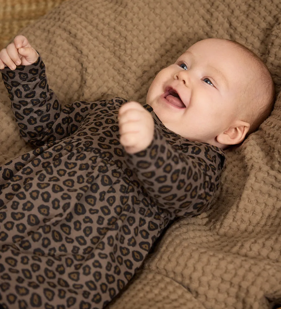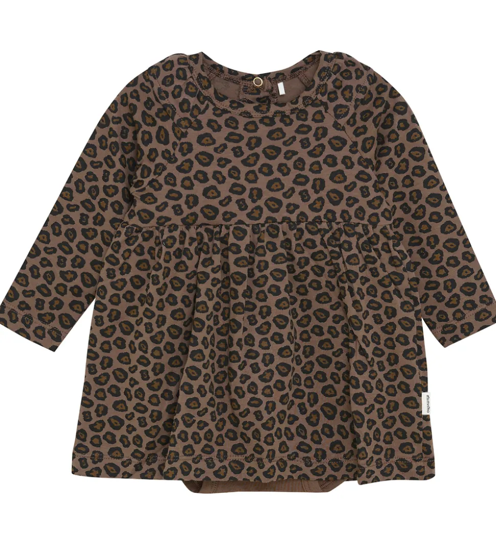 Elegant Minymo kjolebody i brun med leopardprint i sort og brun. Minymo kjolebodyen har lange ærmer og rund halsudskæring med trykknapper i nakken. Kjolebodyen har flæser ved skuldrene og en syning i taljen, som giver skørtet god vidde. Den lukkes med trykknapper mellem benene.