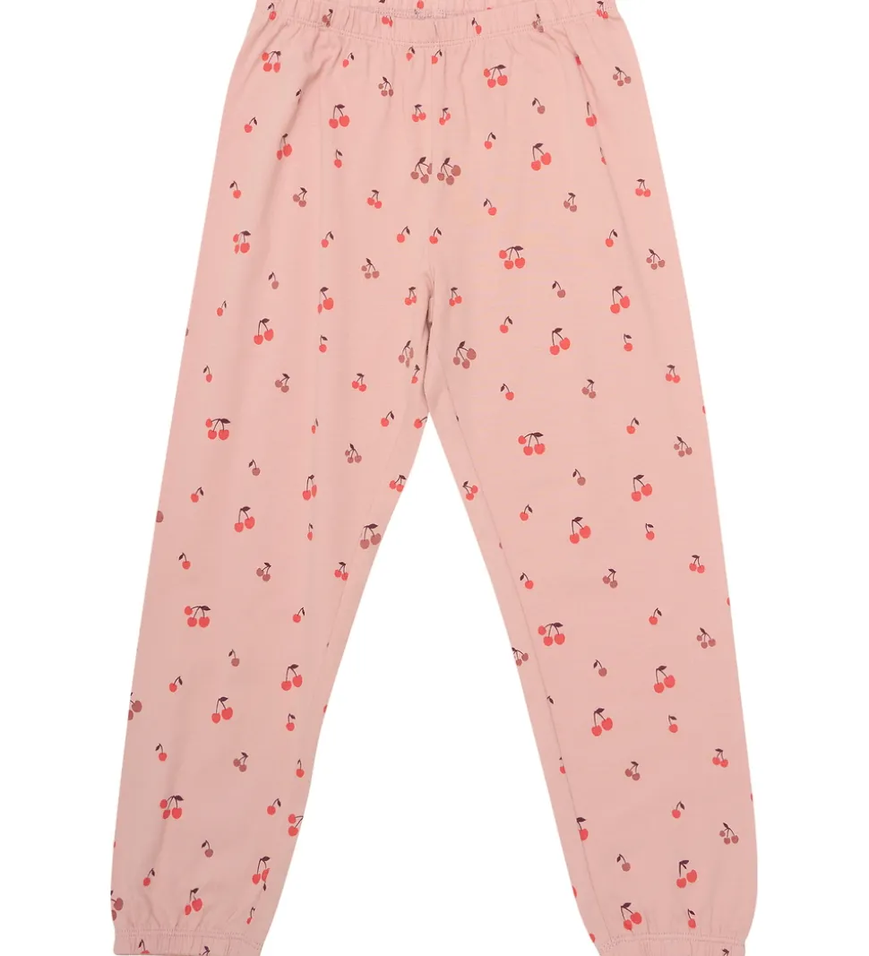 Dejligt Minymo nattøj i en blød rosa farve. Minymo sættet har en langærmet bluse med et charmerende kirsebærprint på fronten og matchende bukser med et all-over kirsebærmønster.