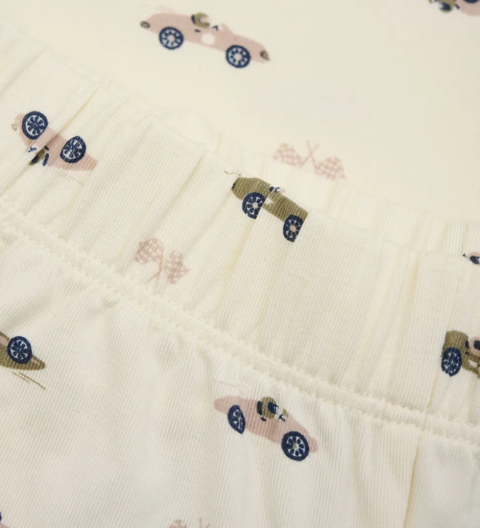 Smart Minymo nattøj, der består af en natbluse og et par natbukser i cremehvid med et fint alloverbilprint.