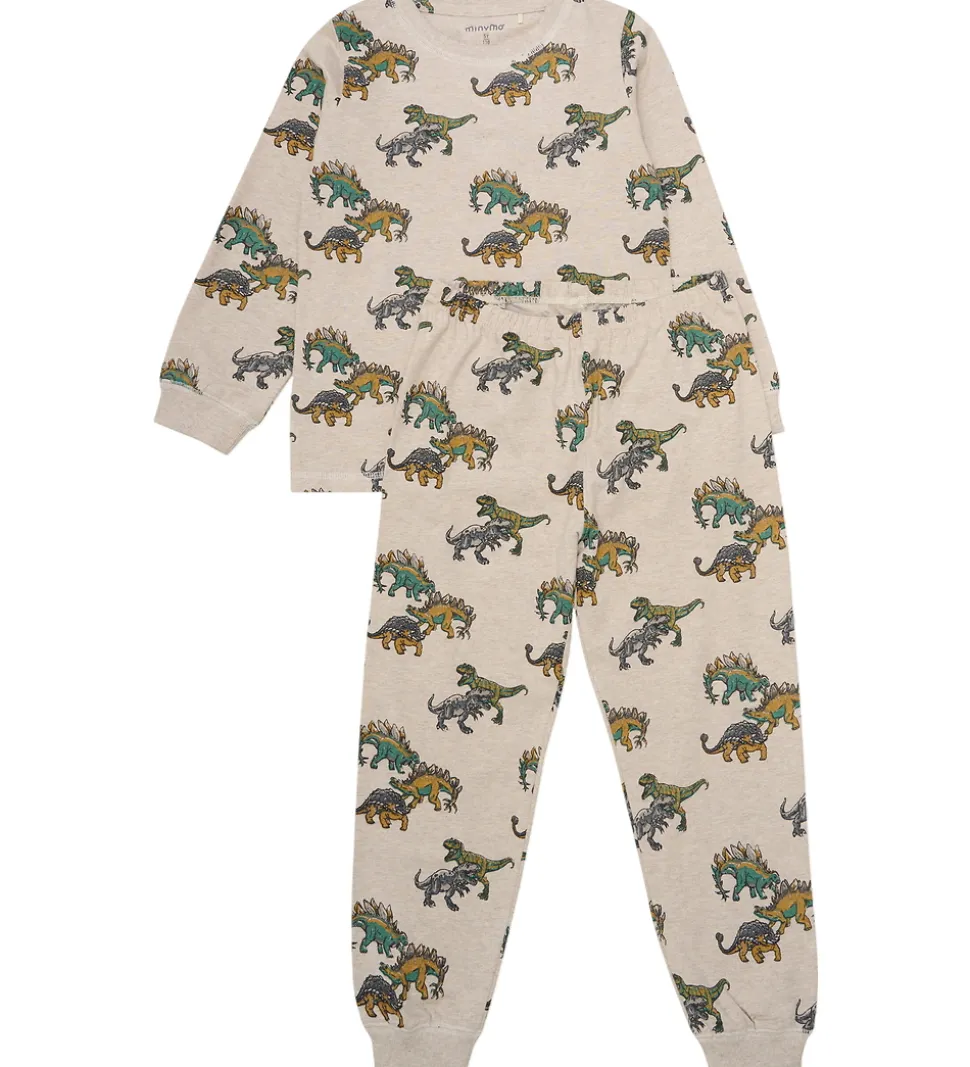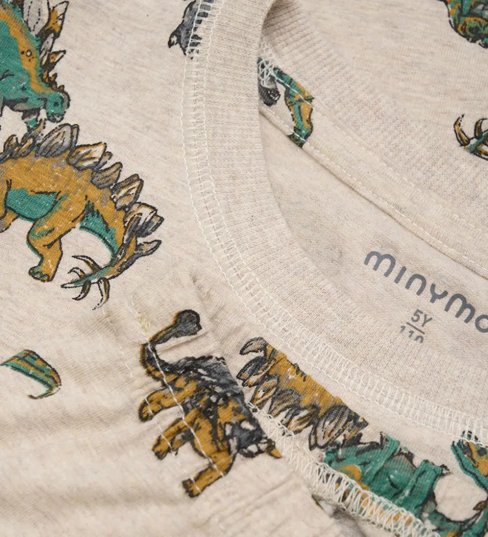 Dejligt 2-delt Minymo nattøj i en flot beige nuance. Sættet har et smart alloverprint af farverige dinosaurer på både bluse og bukser, der giver et sjovt og skønt look.