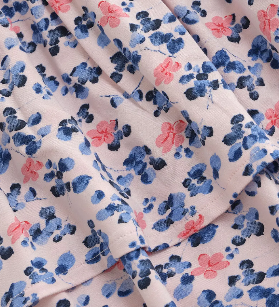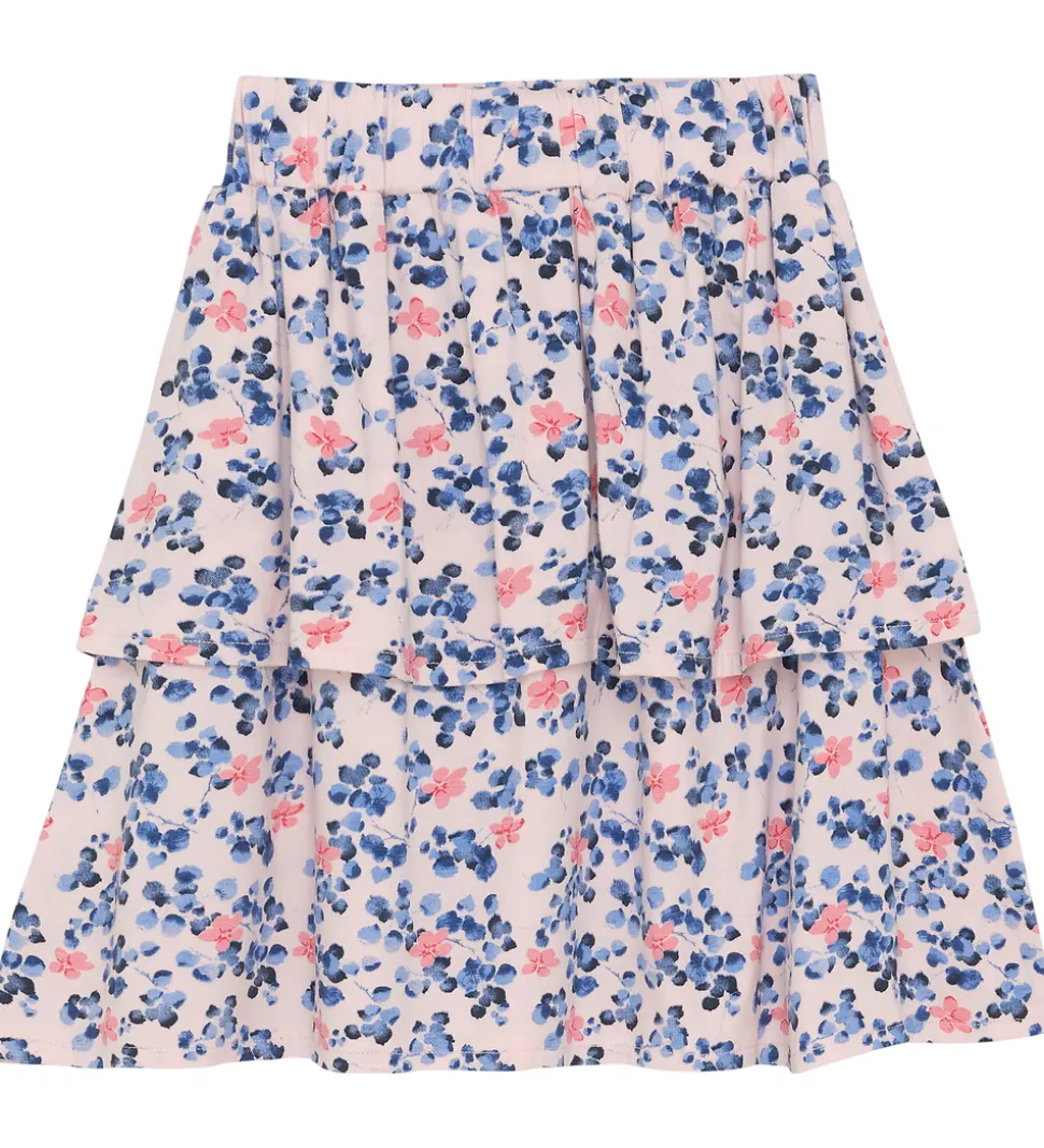 Smuk Minymo nederdel med et livligt blomsterprint i blå og rosa nuancer. Minymo nederdelen har en blød, elastisk talje og et todelt lag, der giver struktur og liv til designet.