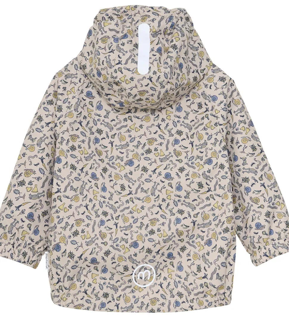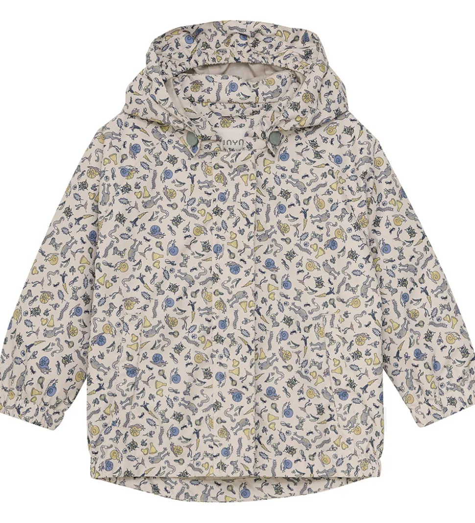 Sej Minymo regnjakke i en varm, grå nuance med alloverprint af smådyr og planter i grønne, blå og gule nuancer. Regnjakken er i en lækker PE-kvalitet.