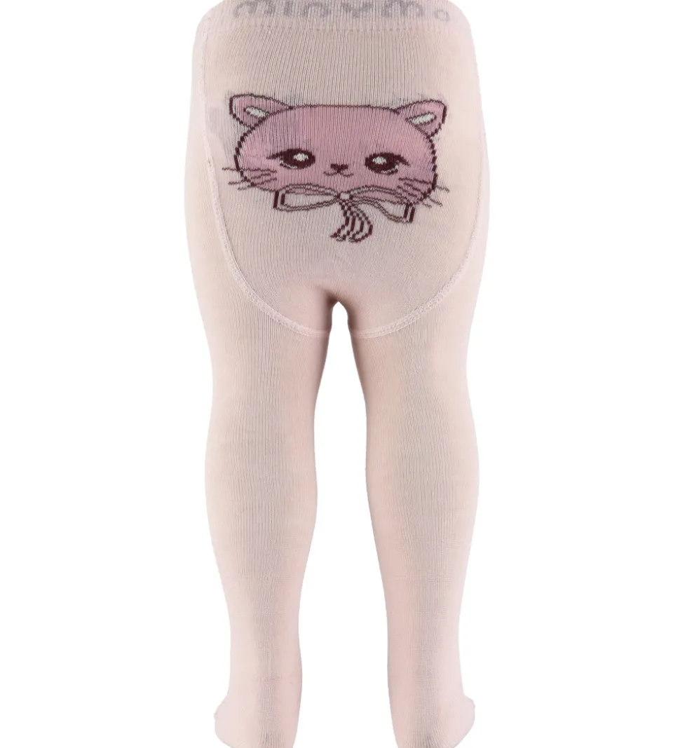 Flotte Minymo strømpebukser i rosa, og bagpå er der et stort print med en kat i mørk rosa og bordeaurød. Ned ad siderne på benene er der et diskret hulmønster. Minymo strømpebukserne har en elastisk talje for en sikker pasform.