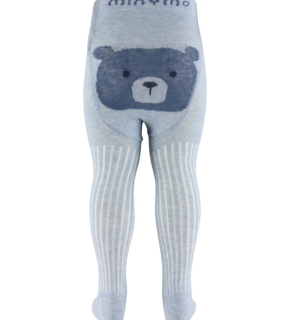 Indbydende Minymo strømpebukser i en flot lys blå nuance. Strømpebukserne har et charmerende bjørne hoved på bagsiden i blå nuancer, som giver et legende touch. De har en elastik i livet som sikrer god pasform og støtte.