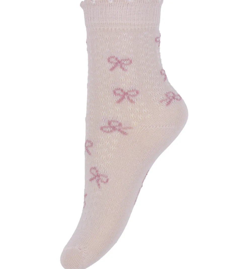 Fine Minymo strømper solgt i en 2-pak. Det ene par er meleret beige med hvide prikker og en brun sløjfe øverst på skaftet, og det andet par er rosa med hvide prikker og små mørkrosa sløjfer.