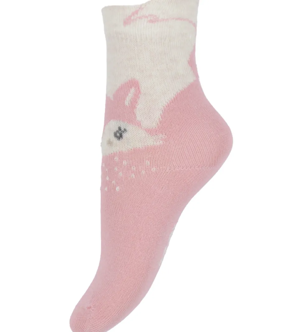 Søde Minymo strømper solgt i en 2-pak. Det ene par er meleret beige og cremefarvet med et motiv med et dådyr, og det andet par er rosa og cremefarvet med et motiv med et dådyr.