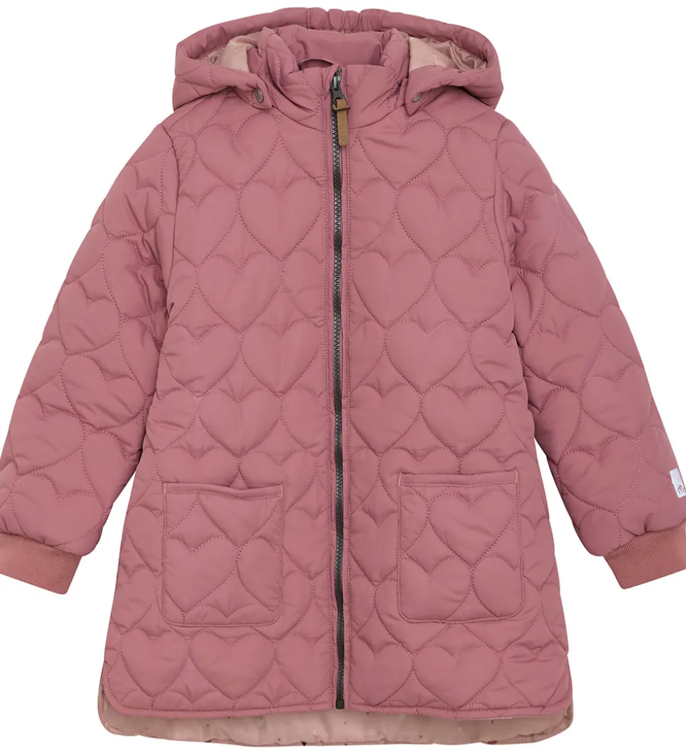 Skøn Minymo termojakke i en varm rosa nuance med hjerteformet quiltet struktur.
