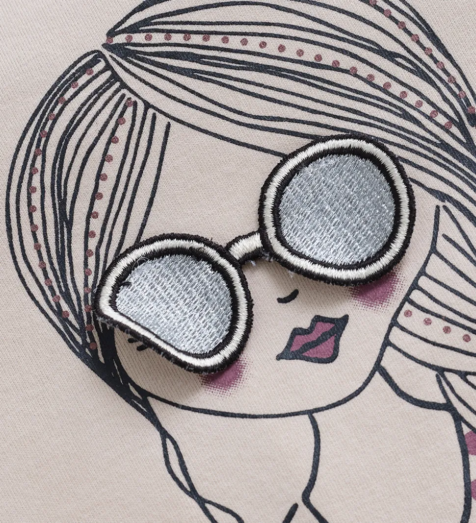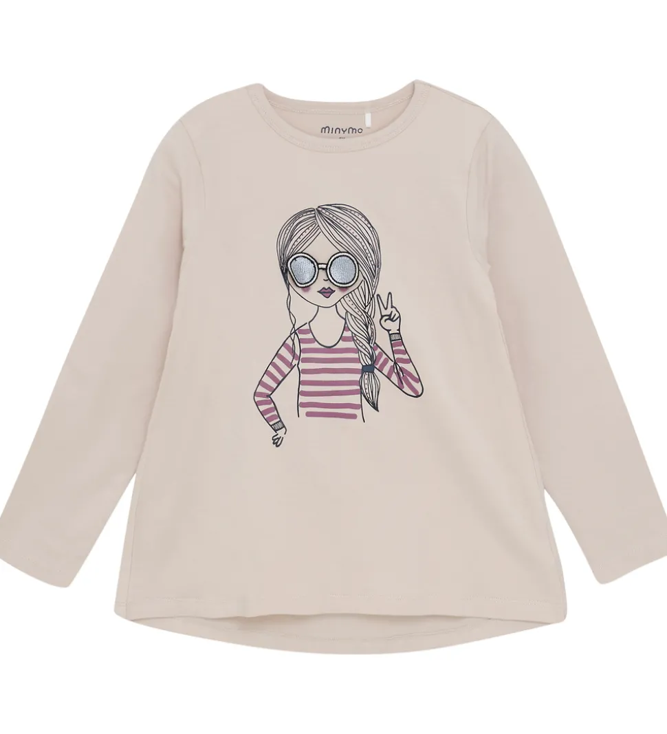 Flot Minymo tunika i en lys beige nuance med et print på fronten af en pige med stribet bluse og solbriller, som kan vippes op. Minymo tunikaen har en rund halsudskæring med trykknapper ved venstre skulder og lange ærmer.