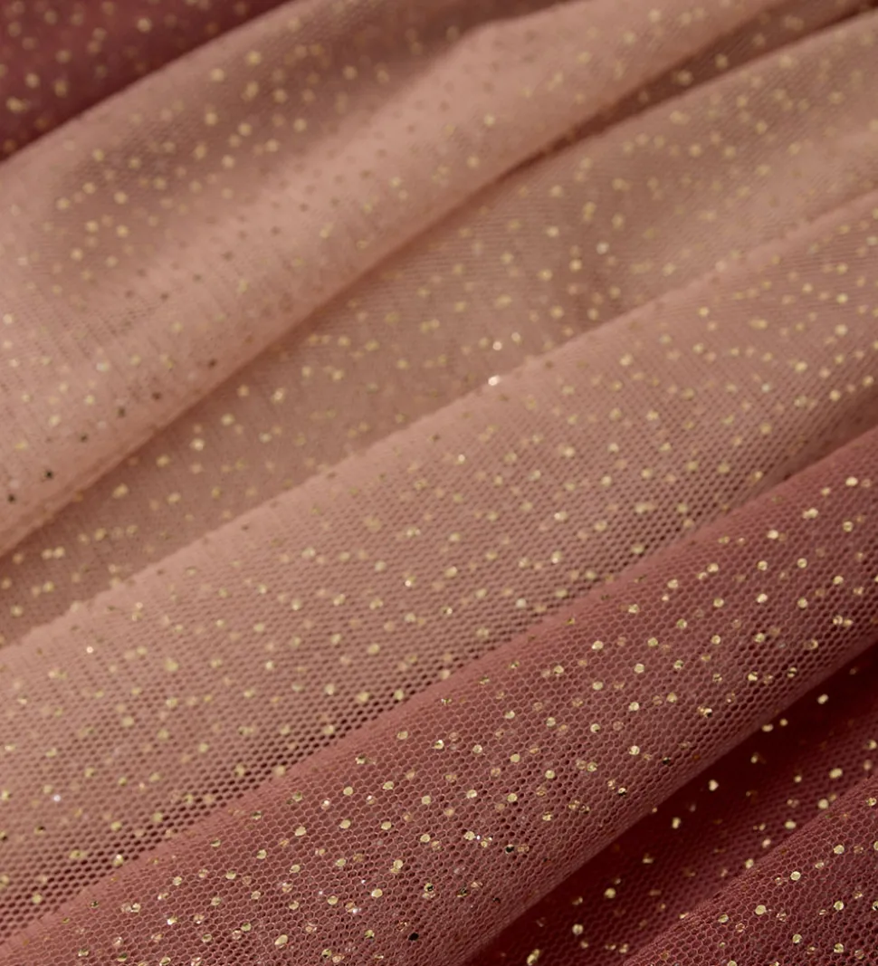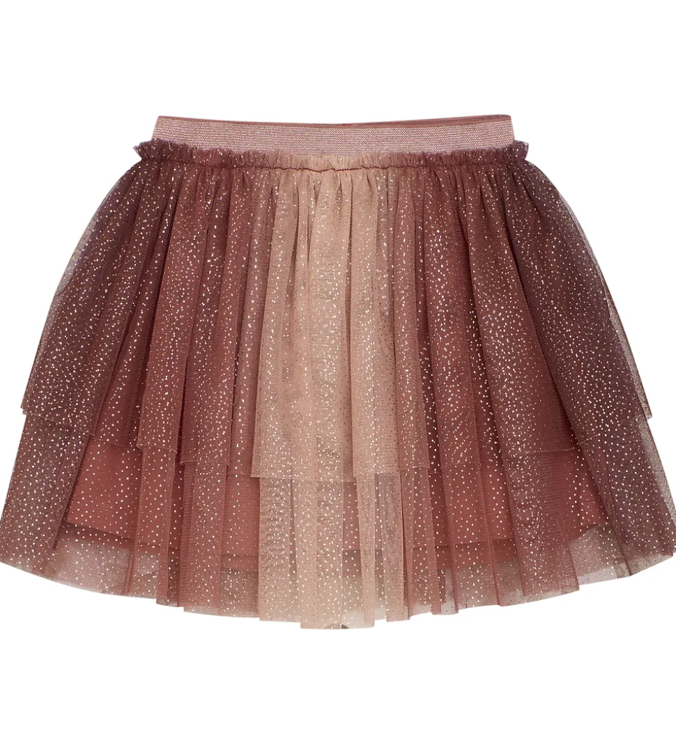Flot Minymo tylnederdel i brune og rosa detaljer med guldglimmer, og i livet har den en bred elastikkant med glimmer. Minymo nederdelen består af to lag med to lag tyl yderst og et lag i kraftigt, gammelrosa bomuldsjersey på indersiden.