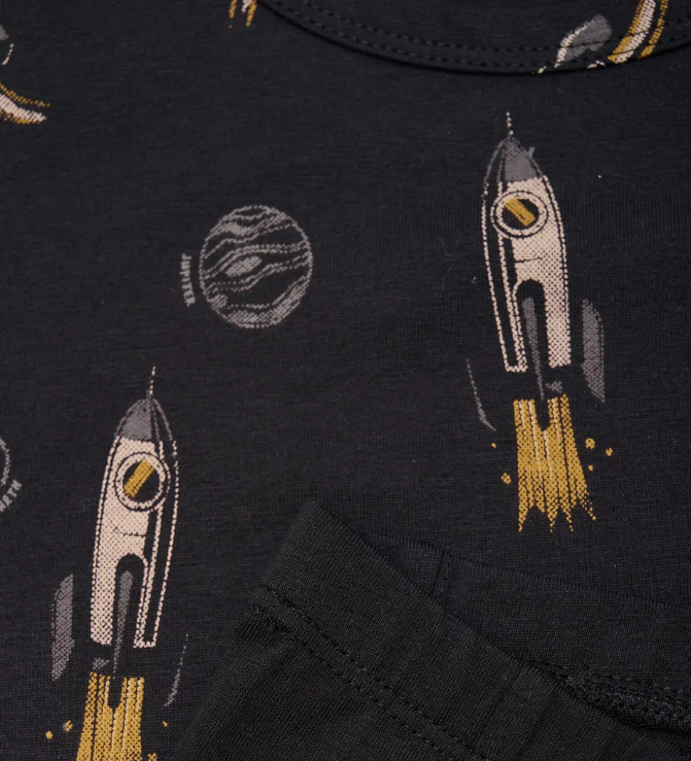 Flot Minymo undertøj i sort med et sejt, farverigt raketprint. Minymo sættet består af en ærmeløs undertrøje og boksershorts, der tilsammen udstråler en eventyrlig stil med kosmiske motiver.