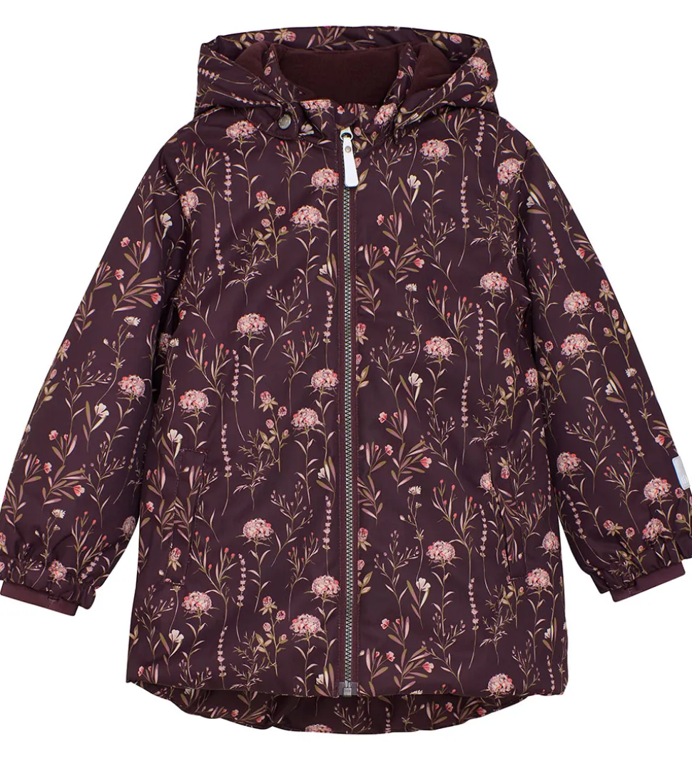 Fin Minymo vinterjakke i mørk lilla med et alloverprint af blomster i rosa, lilla og grønne nuancer. Vinterjakken har refleksdetaljer på hætten og på ryggen.