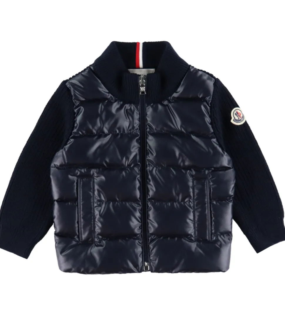 Moncler cardiganen er lavet i en strikket kvalitet, og hele fronten er lavet i en dunvatteret polyesterkvalitet med dekorative syninger, så den får et dunjakke-look.