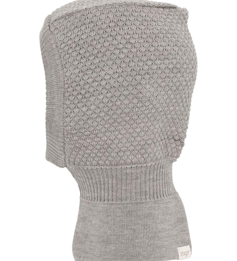 Elegant MP elefanthue i gråmeleret med et strikket strukturmønster. MP elefanthuen består af to lag og har en rund hovedform med ribkant nederst.