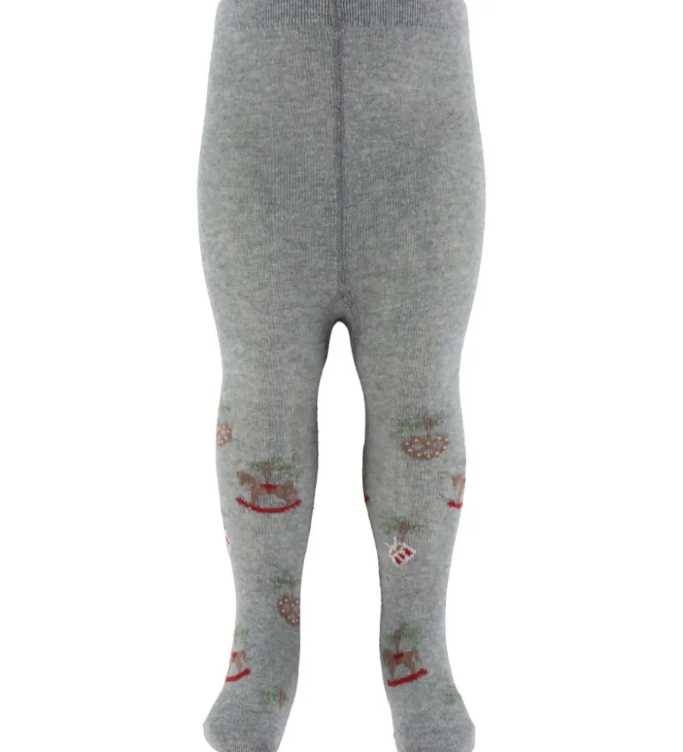 Charmerende MP strømpebukser i gråmeleret med et fint mønster af julemotiver, der inkluderer gyngeheste og kringler. Strømpebukserne har elastik i livet for en god pasform og er lavet i et blødt materiale, der føles behageligt mod huden.