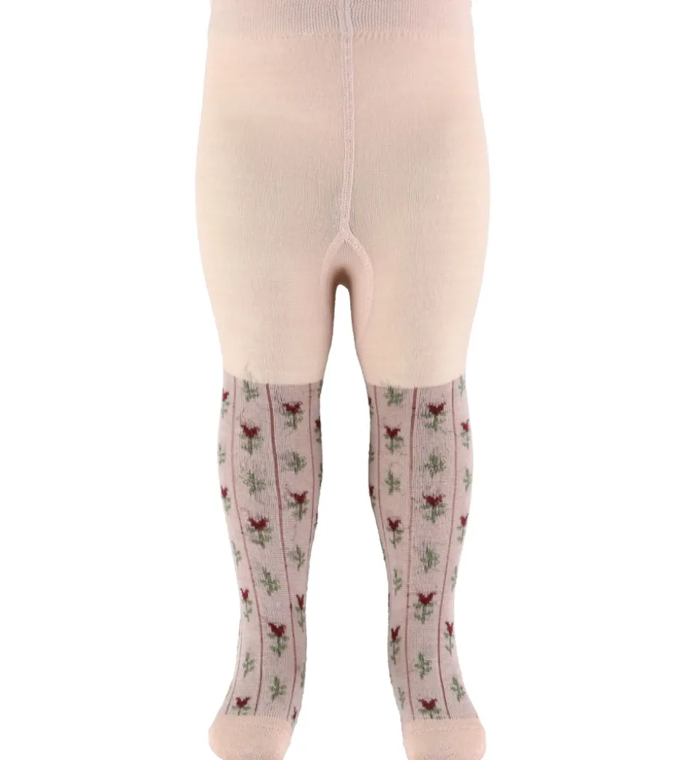 Delikate MP strømpebukser i rosa og lilla med ribstruktur og blomsterprint i rød og grøn. Ved fødderne er der detaljer i guld glimmer. Strømpebukserne har en god elastik i livet.