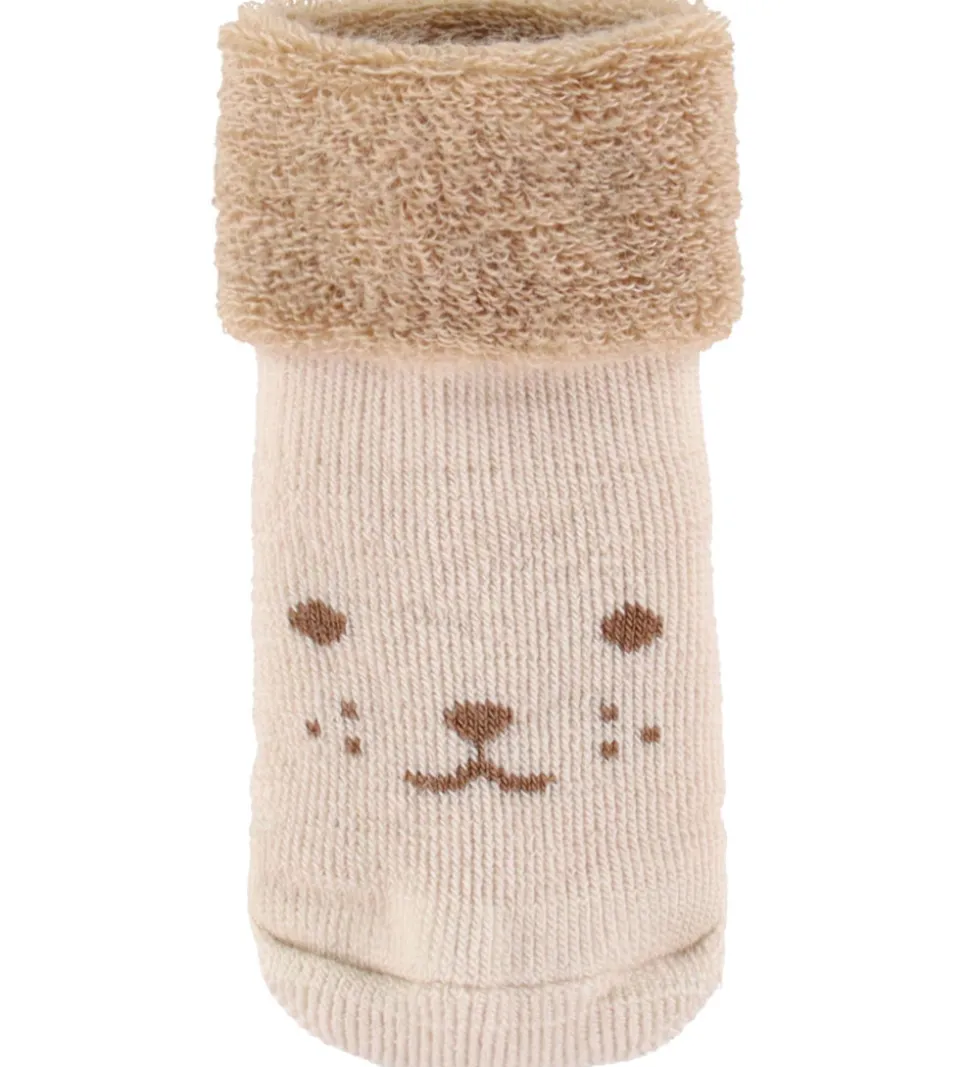 Bløde MP strømper i en lysebeige nuance med et sødt ansigt på foden. MP strømperne har et kort skaft med en bred opslået kant, der giver en god pasform omkring anklen.
