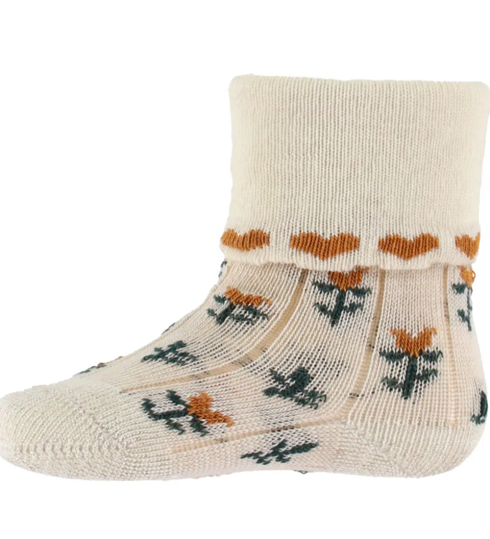 Charmerende MP strømper i beige, dekoreret med fine blomster i orange og mørkegrøn.