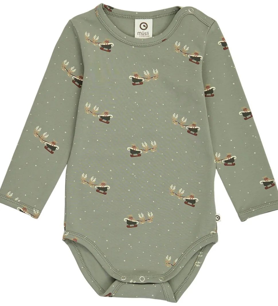 Flot Müsli body med lange ærmer i en fin støvet grøn nuance. Bodyen er dekoreret med et charmerende julemotiv af rensdyr med slæder og små hvide prikker, som giver et vinterligt udtryk. Müsli bodyen har en rund halsudskæring og praktiske knapper ved skuldrene, hvilket gør den nem at tage af og på. Forneden lukkes bodyen med knapper, der sikrer en god pasform omkring bunden.