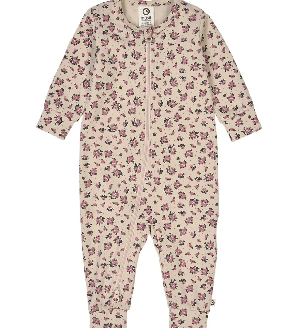 Skøn Müsli heldragt i en lys beige nuance med et charmerende blomsterprint i rosa farver.