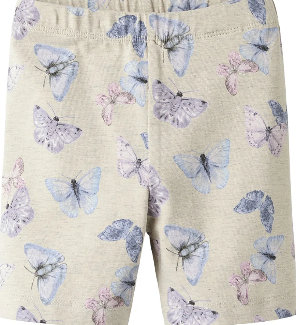 Fine Name It shorts i lys, meleret beige med et fint sommerfugleprint i lilla og blå nuancer. Name It shortsene har en elastisk talje og en tætsiddende pasform.